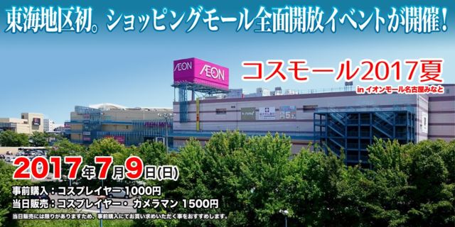 このコニュニティのイベントトピックはイベントのエントリー応募ではなく、「参加表明・交流」のためのトピックです。募集期限が設定されていますが、エントリー募集とは関係ありませんのでご注意下さい。 https://twitter.com/cos_mall 東海地区初。ショッピングモール全面開放型コスプレイベント「コスモール」公式です。7月9日(日)に「コスモール2017夏」を開催いたします。コスプレ、痛車を始め、様々な企画やステージプログラムをご用意しております。前売りチケットは近日発売予定です。※イベント公式サイトは今週末オープン予定