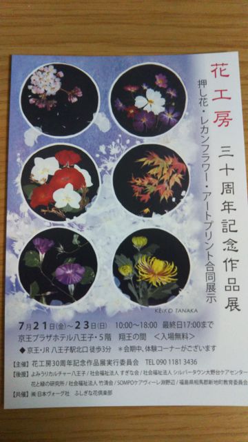 ロズリンさんこんにちは。 どうもご無沙汰しています。 すみませんが、こちらで告知させて下さい。 私が所属する花工房で30周年記念作品展が7月21〜23日まで京王プラザホテル八王子で開催されます。 私の作品も何点か出展してまして、役員としてもお手伝いさせてもらっています。 会期中体験コーナーもありますので、是非足を運んでみて下さい。