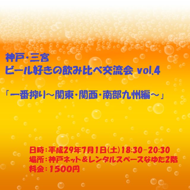 「ビール好きの飲み比べ交流会vol.4」を開催します♪ 今回は「一番搾り〜関東・関西・南部九州編〜」をテーマに みんなで色々な都道府県の一番搾りを飲みながら楽しいひとときを過ごしませんか? 日時:平成29年7月1日(土)18:30-20:30 場所:神戸ネット&レンタルスペースなゆた2階 〒651-0097 神戸市中央区布引町3‐2-1 対象:20歳以上のお酒、ビール好き ※ビールが苦手な方もソフトドリンクを用意しています。 参加費:1,500円(おかず3品程度、一番搾り&他ビール、ジュース込) 定員:15名程度(満員となった場合キャンセ