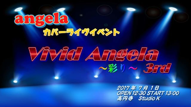 管理人様、こちらの場所をお借り致します。 7月1日にangelaさんの曲オンリーのライブをさせていただくことになりました!3年ぶりの開催になります。 angelaファンの方には特に楽しんでいただけると思いますので、お時間のある方はぜひ遊びに来ていただければと思います。 「Vivid Angela〜彩り〜3rd」 日時:2017年7月1日(土) Open 12:30 Start 13:00 (15:30終了予定) 場所:高円寺Studio K (Studio 3)@高円寺駅徒歩7分 http://www.kobayashi-yk.com/html/studio-k/ Charge:2800円 (こちらで早割あります。http://ang