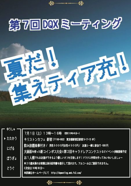 ※受付12時30分〜 コスして頂く方は12時15分〜 あと若干名様募集中です♪ ドラクエ10好きの皆様おまたせしました!! 7月1日(土)の13時から3時間、第7回新宿180人DQXミーティングin summerを開催致します!! 延べ3年やらさせてもらったオフですが、主催及びスタッフも仕事多忙になりつつあるので今回で一区切りにしようと思います(誠に勝手ですいません...) 皆様に今まで育てて頂いたオフなので最高に楽しんで頂けるよう最強頑張らせてください! お店はいつも予約でいっぱいで土日料金と貸切料金が合わなくてで