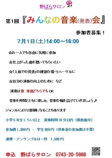 奈良県大和郡山市 野ばらサロン 第1回 『みんなの音楽会』 参加者募集! 2017年7月1日(土) 14:00〜16:00 ☆お一人でも自由に気軽に参加 ☆仕上がった曲を聴いてもらいたい ☆「人前での発表」の練習の場・リハーサルに ☆自分の演奏の向上のために etc ☆歌 楽器どちらでもOK 音楽を仲間とともに楽しみ、音楽の輪を広げていきましょう。 ジャンルにより2部制になることもあります。 小学5年生位から参加可 演奏時間10分以内(複数曲可) 参加費1,000円 学生80