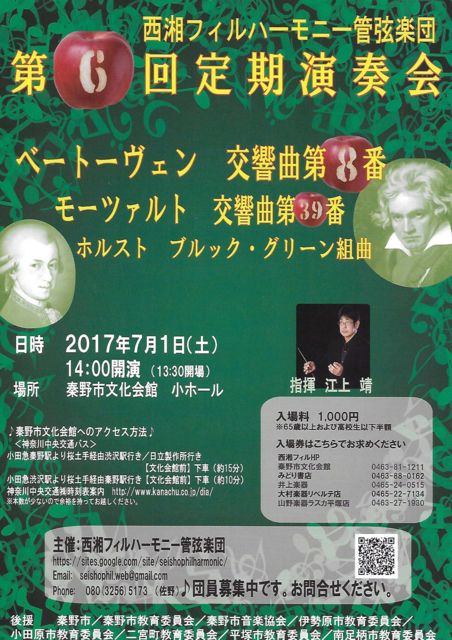 西湘フィルハーモニー管弦楽団は神奈川県秦野市で活動中のアマチュアオーケストラです。 https://sites.google.com/site/seishophilharmonic/ モーツァルト後期三大交響曲の一つ39番とベートーヴェンの8番に挑戦します。 ご来場をお待ちしております。 第6回定期演奏会 開催日:2017年7月1日 (土) 14時開演(13:30開場) 会場 : 秦野市文化会館 小ホール 秦野駅から 秦野08桜土手経由渋沢駅北口行〔文化会館前〕下車(15分) 渋沢駅から秦野08桜土手経由秦野駅行 〔文化会館前〕下車(10分) 注:バスの本数が少ないので余裕を