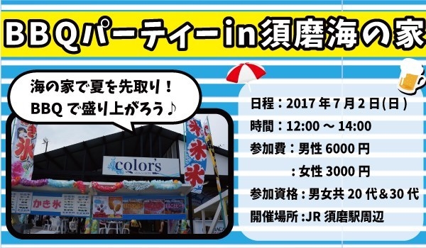 海の家で開催! 開放的なBBQパーティー☆ 夏を先取って楽しみましょう♫ http://event-chu.com/20170702_hyogo/ イベント内容 海の家を貸しきってBBQパーティーを開催♫ 海を見ながら飲んでお肉を食べて交流を楽しみませんか◎ アクセス抜群の須磨海岸で開催☆★ 会場はJR須磨駅下車すぐの好立地です◎ 海には楽しい遊び方が満載!!楽しみ方は自由! かき氷・ビーチバレー・海水浴・サンオイル・浮き輪・ビーチパラソル・スイカ割り・ジェットスキーなどなど 今年も海で素敵な思い出をたくさん作りませんか☆★ ※