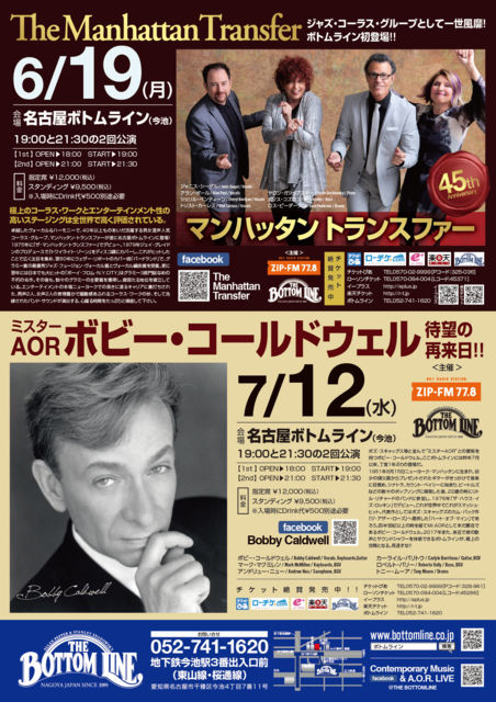 ★マンハッタントランスファー 名古屋ボトムライン公演 名古屋ボトムライン初登場です! 2017年6月19日(月) <WEB予約ページ> http://www.bottomline.co.jp/bottomline/4507/ <Facebookページ> https://www.facebook.com/TMT.bottomline/ ★ボビーコールドウェル 名古屋ボトムライン公演 2017年7月12日(水) <WEB予約ページ> http://www.bottomline.co.jp/bottomline/4630/ <Facebookページ> https://www.facebook.com/BobbyCaldwell.nagoya/ ◎両公演、以下内容共通です◎ 【1st】 開場 6:00PM/開演 7:00PM