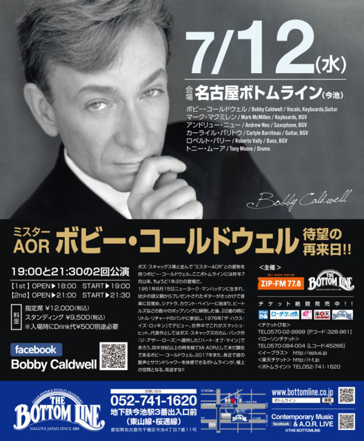 管理人様へ 名古屋のボトムラインの者です。 先日はマンハッタントランスファー公演、無事に終了いたしました。ありがとうございました。 ボビーコールドウェルの7/12名古屋公演の告知を宜しくお願い致します。 第2部の方がまだチケットがございます。 ★ボビーコールドウェル 名古屋ボトムライン公演 2017年7月12日(水) <WEB予約ページ> http://www.bottomline.co.jp/bottomline/4630/ <Facebookページ> https://www.facebook.com/BobbyCaldwell.nagoya/ 【第1部】開場 6:00PM/開演 7:00PM 【第2部】