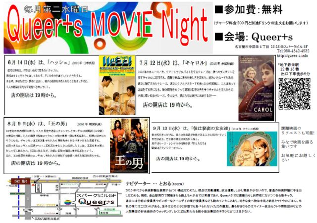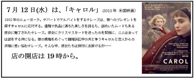 【7/12】Queer+s MOVIE Night! 7月は「キャロル」(2015年 米国映画) 毎月第二水曜日は、Queer+s MOVIE Night! 7月の第58回は「キャロル」(2015年 米国映画)について語りましょう! ■7月12日(水)19:00〜 ■参加費:無料 (チャージ料金500円と別途ドリンクの注文をお願いします。) ■会場: Queer+s (地図と詳細は下記) http://queer-s.info/ 1952年のニューヨーク。デパートでアルバイトをするテレーズは、 娘へのプレゼントを探すキャロルに応対する。 優雅で気品に満ちた美しさを誇るも、謎めいたムードもある彼女に魅了された