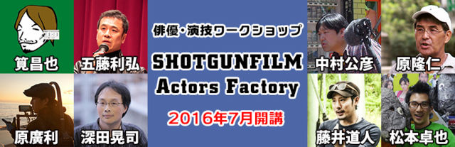 今年の7月より、現役の映画監督が講師を務める演技ワークショップを開始いたします。 <俳優・演技ワークショップ SHOTGUNFILM Actors Factory> 2016年7月19日〜2017年1月27日 http://shotgunfilm.com/workshop_top.html 参加監督は以下の方々です。 ☆昨日開幕した第69回カンヌ国際映画祭「ある視点部門」に、浅野忠信主演の最新作『淵に立つ』を出品。受賞の期待が高まる深田晃司監督 ☆『世にも奇妙な物語』『死神くん』『素敵な選TAXI』など話題のテレビドラマで活躍する筧昌也監督 ☆伊坂幸太郎原作・岡田将生主演『オー!ファー