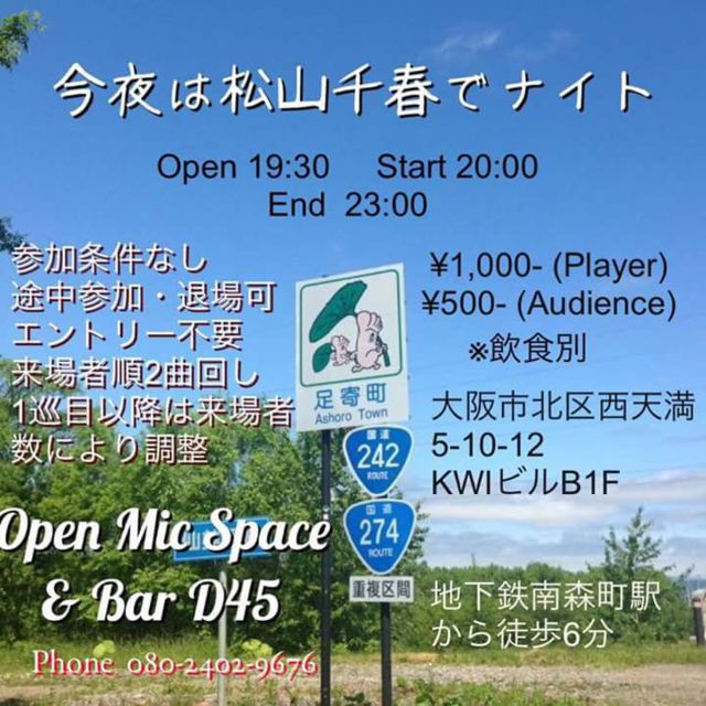 オープンマイクスペース&バーD45 http://d45.biz/ ☆住所☆ 大阪市北区西天満5−10−12 KWIビル(旧セイブビル)地下1階 どなたでも参加出来ます 途中参加、途中退場可 エントリー不要。来場者順2曲回し以降〜来場者数にて調整 参加費は通常と同じで1000円(ステージチャージ込・飲食別) 食べ物は持ち込み可。ドリンク不可 懐かしい曲・マニアな曲・ベタな曲・未発表曲色んな弾き語り で盛り上がりながら千春談義・お宝紹介・情報交換諸々楽しみましょう♪ ****************************