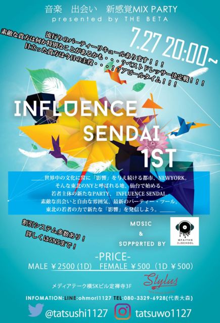 【新感覚青年交流パーティー Influence SENDAI】 ______________世界中に常に影響を与え続ける都市、NEWYORK。 そんな東北のNYと呼ばれる地、SENDAIで始める若者主体のあらたなPARTY、 Influence SENDAI。素敵な仲間に自由な雰囲気、最新のパーティー・ツール。 東北の若者の力で新たな【影響】を発信しよう。_____________________ 【当イベントコンセプト】クラブや街コンなど、決まりのある交流の場ではなく第三の選択肢として様々な目的で参加することの出来る、自由なパーティーを目指し