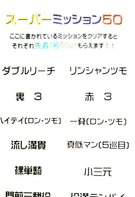 今回は納涼祭です!! 我々インドア派はなかなか夏っぽい事やらずに夏が過ぎてしまっているので、この日だけは夏っぽい格好して麻雀しましょう!! ★夏っぽい格好のレベルに応じてポイント付与 アイテム1点に付 10pt アロハシャツ 20pt 甚平 30pt 女子のノースリーブ 30pt 浴衣 40pt 水着、海パン 50pt ミニスカート 膝上/pt 麻雀イベントは『なんでもパオ』と『スーパーミッション50』です! 詳しくは画像を見てください。 打姫会は麻雀を愛する紳士と淑女なら誰でも参加できるノーレート麻雀オフ会です! 成績はポイント、着順、連対