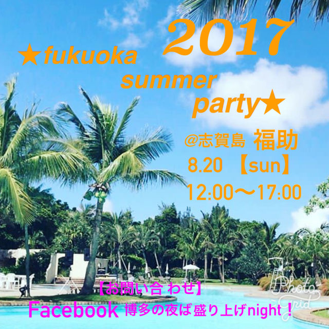 夏ですねぇ! 今年もやりますよ! 今年は 飲食店、アパレル、車屋がコラボで激アツな イベントになっております! 2017 beach party♪ ↓早速詳細でございます↓ 【日にち】8.20〈日曜日〉 【時間】 12:00〜17:00 〈BBQ+飲み放題+ジェット乗り放題+dj music+シャワー代+海の家使用料金すべて込み〉 【料金】 当日→ men \6000 women \5000 前売り→ men \5000 women \4000 小学生まで無料! 【会場】 志賀島 海の家 福助 内容はBBQだけでなく、キンキンに冷やしたそうめん