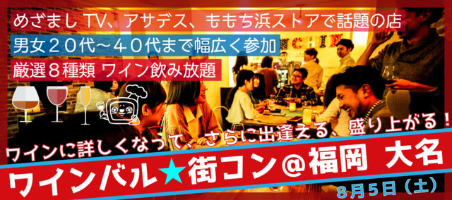 テレビ番組で話題となっているワインビストロで ワインを飲もう!出逢おう! ワインが好き・もっとワインに詳しくなってみたい。 ワイン好きな人と仲良くなって、飲みに行きたい。 ワイン好きにぴったりな 『ワインバル★街コン@福岡 大名』が 8月5日(土)に開催されます! ◆ 男女ともに20代〜40代までOK(独身限定)◆ ◆ 男女比率 同数 ◆ ◆ 女性1名:2500円 ◆ ◆ 男性1名:4900円 ◆ *1名からでも参加できます *当日参加及び、銀行振込に関してはイベント準備に支障が出るため 500円の追加徴収とさせ