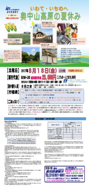 ※募集・開催日が迫っています。ご注意! 首都圏の皆様向けの企画として、奥中山高原での夏休みツアーを募集しております。 親子でも女子旅でも楽しめる内容となっております。 どうぞ、岩手の高原で、楽しい夏休み体験を。 詳しい募集内容はこちらから↓ http://igr-t.jp/2017/07/25/%E5%A5%A5%E4%B8%AD%E5%B1%B1%E9%AB%98%E5%8E%9F%E3%81%AE%E5%A4%8F%E4%BC%91%E3%81%BF%E3%80%80818%E5%87%BA%E7%99%BA%E3%80%902%E6%97%A5%E9%96%93%E3%80%91/