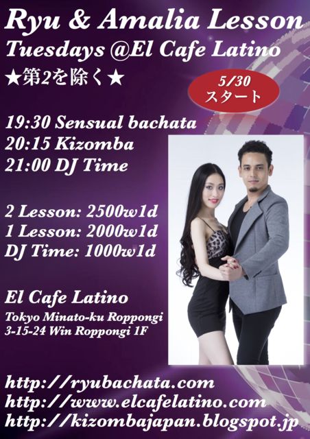 ¡úRyu & Amalia Bachata & Kizomba Lesson & Social¡ú Âç¥Ö¡¼¥àÃæ¤ÎKIZOMBA¤ÈBACHATA¤Î¥ì¥Ã¥¹¥ó¤È¥½¡¼¥·¥ã¥ë¤Ç¤¹¡£ ²ñ¾ì¤Ï¡¢Ï»ËÜÌڤο͵¤¥Ð¡¼EL CAFE LATINO¤Ç¤¹¡£ Kizomba & Bachata lesson & social held every tuesday in Roppongi famous latin club EL CAFE LATINO. ¢¡Æü»þ¡§8·î1Æü¡Ê²Ð¡Ë19:00-Late Ëè½µ²ÐÍËÆü (Âè2¤ò½ü¤¯) ¢¡¾ì½ê¡§Ï»ËÜÌÚ¡ØEL CAFE LATINO¡Ù ÅìµþÅÔ¹Á¶èÏ»ËÜÌÚ3-15-24 WINÏ»ËÜÌÚ2F TEL 03-3402-8989 http://www.elcafelatino.com ¢¡ÎÁ¶â 2 Lesson: 2500w1d 1 Lesson: 2000w1d DJ Time: 1000