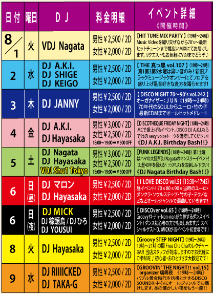 DISCO Groovy 8·î¤ÎÂè1¡õÂè3¡õÂè5²ÐÍËÆü¤Ï VDJ Nagata¤Ë¤è¤ë¡ÚHIT TUNE MIX PARTY¡ÛSOUL¡¢FUNK¡¢DANCE CLASSICS¡¢70's¡ÁºÇ¿·HIT¶Ê¤Þ¤ÇMusic Video¤ò¿¥¤ê¸ò¤¼¤Ä¤Ä¤«¤±¤Þ¤¯¤ê¤Þ¤¹¡ª¥ê¥¯¥¨¥¹¥È¤Ë¤â½ÐÍè¤ë¸Â¤ê¤ª±þ¤¨Ãפ·¤Þ¤¹¤Î¤ÇVDJ¤Þ¤Ç¤ªµ¤·Ú¤Ë¤É¤¦¤¾¢ö ¡Ú²»³Ú¡ÛALL MIX ¡Ú³«ºÅ»þ´Ö¡Û19:00¡Á24:00 ¡ÚÎÁ¶â¡Û ÃËÀ¡§¡ï2,500/2Drinks ½÷À¡§¡ï2,000/2Drinks ¡ÚVDJ¡ÛNagata