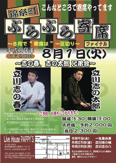 8/1¡Ê²Ð¡Ë¡Ø¶Ó»åÄ®¤Ö¤é¤Ö¤é´óÀÊ 95²óÌܡ٠¶Ó»åÄ®¤Ö¤é¤Ö¤é´óÀÊ ¥Õ¥¡¥¤¥Ê¥ë¡¡¡Á £¸·î¤Ç "´óÀʤÏ" °ì¶èÀڤꡪ¡Á ½Ð±é¡§Î©Àî»Ö¤Î½Õ¡¢Î©Àî»Ö¤ÎÂÀϺ ³«¾ì18:30¡¡³«±é19:00¡¡ ÌÚ¸ÍÁ¬¡¦Í½Ìó 2000±ß¡ÊÅöÆü 2300±ß¡Ë ¤³¤ÎÅÙ¡¢¶Ó»åÄ®¤Ö¤é¤Ö¤é´óÀʤϣ¸·î¤Î¸ø±é¤ò»ý¤Á¤Þ¤·¤Æ°ì¶èÀÚ¤ê¤È¤µ¤»¤ÆÄº¤¤Þ¤¹¡£ ¤½¤ÎÂè°ìÃÆ¤È¤·¤Æ¡¢»Ö¤Î½Õ¤µ¤ó¡¢»Ö¤ÎÂÀϺ¤µ¤ó¤Î·»Äï²ñ¤Ç¤¹¡£ ½ª±é¸åÂǤÁ¾å¤²²ñ¤¬¤¢¤ê¤Þ¤¹¡£ £±»þ´Ö30ʬ¡Ê°û¤ßÊüÂê¤Ï£±»þ´Ö¡Ë¡¢¤ª¤Ä¤Þ¤ß¡¢·Ú¿©¤òÍѰդµ¤»¤ÆÄº¤¤Þ¤¹¡£ »²²ÃÈñÊÌÅÓ¡¦¥¢¥ë¥³¡¼¥ë2100±ß¡¿¥½¥Õ¥È¥É¥ê¥ó¥¯1600±ß¡£ ¤´Í½