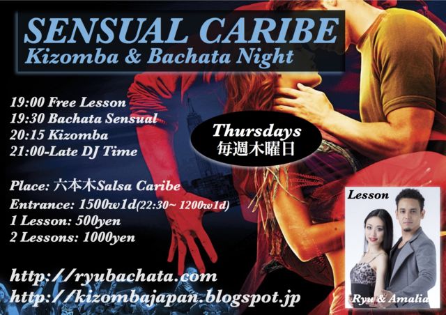 Kizomba & Bachata social held every thursday in Roppongi famous latin club SALSA CARIBE. Lesson by Ryu & Amalia.
