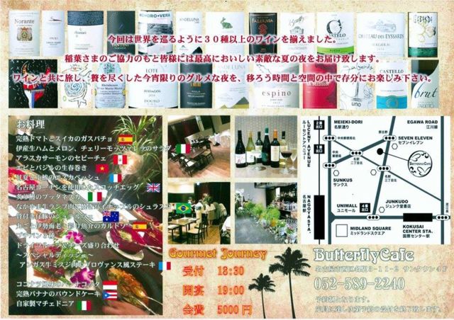 いや、暑いから手抜きして、お店のワイン会にのっかったという訳ではありませんよ(笑) これまでも何度か魅力的なワイン会をされているお店だったので、 8月こそは!ということで日にちを開けて待ってました!!(ホントの話) インポーターの稲葉さんのご協力のもと、30種類の世界中のワインを楽しみつつ、 料理も世界中のワインに合う料理を取り揃えていただけるそうです(^_−)−☆ ◇日時:8月7日(月)19:30〜 ◇お店:「Butterfly Cafe (バタフライカフェ)」 名古屋市西区名駅3-11-2 サンタウン名駅 4F