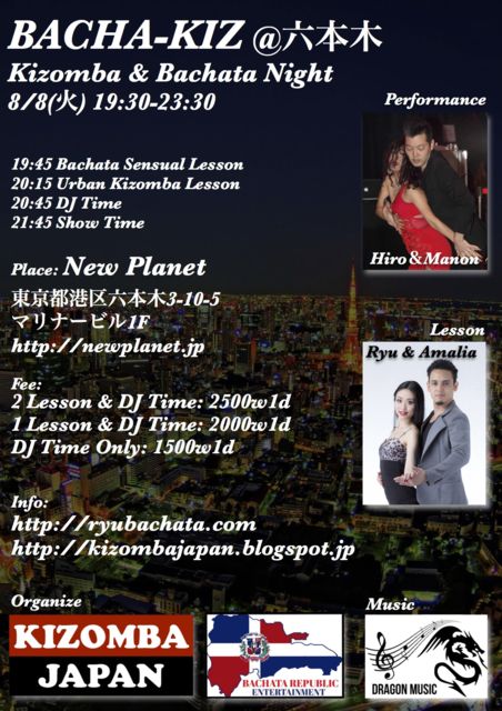 ¡úBACHA-KIZ¡ú ¥¥¾¥ó¥Ð¤È¥Ð¥Á¥ã¡¼¥¿¤ò¤¿¤Ã¤×¤ê³Ú¤·¤á¤ë¥¤¥Ù¥ó¥È¤Ç¤¹¡£ ¥ì¥Ã¥¹¥ó¤Ï¥è¡¼¥í¥Ã¥Ñ¤ÇÂç¿Íµ¤¤Î¥¢¡¼¥Ð¥ó¥¥¾¥ó¥Ð¤È¥»¥ó¥·¥å¥¢¥ë¥Ð¥Á¥ã¡¼¥¿¤Ç¤¹¡£ º£²ó¤Î¥²¥¹¥È¥Ñ¥Õ¥©¡¼¥Þ¥ó¥¹¤ÏHiro¡õManon¤Î¡Ö¥À¡¼¥¯¥µ¥¤¥ÉŽ¥¥á¥ì¥ó¥²¡×¤Ç¤¹¡£¤ª³Ú¤·¤ß¤Ë¡ª ¢¡Æü»þ(Date): 8·î8Æü¡Ê²Ð¡Ë19:30-23:30 ¢¡¾ì½ê(Place): Ï»ËÜÌÚ¡ØNEW PLANET¡Ù ÅìµþÅÔ¹Á¶èÏ»ËÜÌÚ3-10-5¡¡¥Þ¥ê¥Ê¡¼¥Ó¥ë£±F Tel. 03-3470-4340 http://newplanet.jp/ ¢¡ ÎÁ¶â(Fee): 2 Lesson & DJ Time: 2500w1d 1 Lesson & DJ Time: 2000w1d DJ Time Only: 1500w1d (Aft