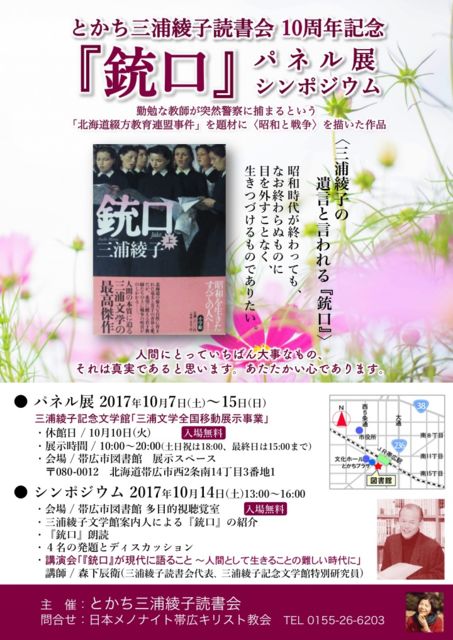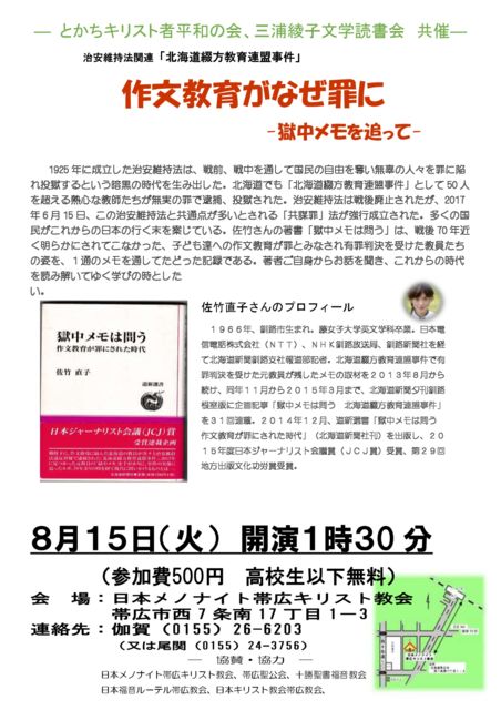【とかち三浦綾子読書会からのお知らせ】 来る8月15日にとかち三浦綾子読書会では佐竹直子さんをお招きして、講演会を開きます。 佐竹直子さんは北海道新聞釧路支局の記者で、「北海道綴方教育連盟事件」の当事者(元教員)が残した「獄中メモ」をきっかけに、日常の業務をこなしながら、遺族・関係者の取材を地道に重ね、思想弾圧の実像に迫ることに成功しました。 三浦綾子「銃口」のモチーフとなった事件で実際にどのようなことが行われていたのか、埋もれた歴史の真実を洗い出しに成功しました。 その2013年11月〜2014年6月の北海