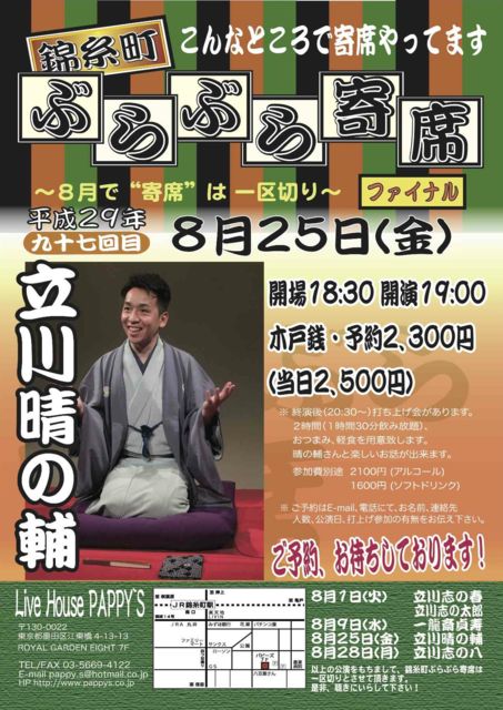 8/25(金)『錦糸町ぶらぶら寄席 97回目』 錦糸町ぶらぶら寄席 ファイナル 〜 8月で "寄席は" 一区切り!〜 出演:立川晴の輔 開場18:30 開演19:00 木戸銭・予約 2300円(当日 2500円) 終演後(20:30〜)打ち上げ会があります。 2時間(1時間半飲み放題)、おつまみ、軽食を用意させて頂きます。 晴の輔さんと楽しいお話が出来ます。 参加費別途 アルコール2100円/ソフトドリンク1600円(ファイナル特別料金) お陰さまで、混みいってきました。 お早めにご予約お願い致します。 ♪♪♪♪♪♪♪♪♪♪♪♪♪♪♪