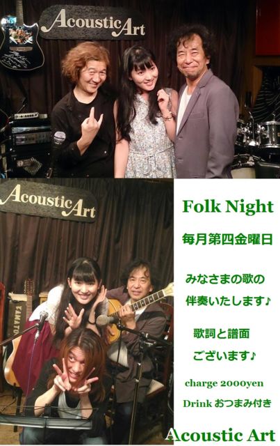 Folk Night vol.13 ★一周年記念★ 8月25日(金) KABU & UKI & KEN & JUN UKI Vocal(弾き語り レパートリー増えてます❣) KABU Guitar & Vocal KEN Pf & Key & Vocal JUN Guitar & Vocal 皆様の 歌の伴奏をさせていただきます♪ 弾き語りさんも 弾きたがりさんも ソロ,デュオ,トリオ etc 大歓迎です。 Open 18:30 Start 19:00 charge 2000yen 1Drink おつまみ 駄菓子とおもちゃ付き♪ Folk Night は 毎月第四金曜日です。 http://youtu.be/FTIQyaisF_s http://youtu.be/qZ