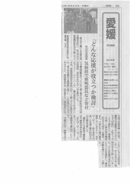 ■第161回 東日本復興応援ライブ 8月25日(金) 20:00〜22:00 松山市大街道 スペース田中前にて 募金や被災地へのメッセージを集めています。 このたび、皆様から頂いた募金60万円を、気仙沼へ届けて参りました。 少年サッカーチーム鹿折FCさまへ30万円相当の夜間照明器具。 子どもたちの遊び場を提供する団体「あそびーばー」さまへ30万円。 皆さまのご協力ありがとうございます。 引き続き応援をよろしくお願いいたします。 ☆お知らせ☆ 私たちチームのオリジナルソング「ここにいるよ」のCD販売しています。 1枚500円。そのうち311円は東日本復