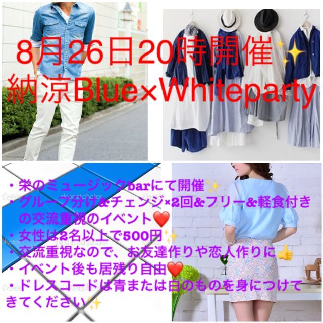 8·î26Æü(Sat)20»þ³«ºÅǼÎÃBlue¡ßWhite¥Ñ¡¼¥Æ¥£ ±É¤ÎÃæ¿´¤Î¥ß¥å¡¼¥¸¥Ã¥¯Bar¤Ë¤Æ³«ºÅ º£²ó¤Ï²Æ¤â½ª¤ï¤ê¤Ë¶á¤Å¤¤¤¿¤³¤í¤Î³«ºÅ¤Ç¤¹¤Î¤Ç¡¢Ç¼ÎäΰÕÌ£¤ò¹þ¤á¤Æ ÀĤޤ¿¤ÏÇò¤Î¤â¤Î¤ÎÃåÍѤò¤ª´ê¤¤¤·¤Þ¤¹♡ ¥°¥ë¡¼¥×ʬ¤±&¥·¥ã¥Ã¥Õ¥ë¡ß2²ó&¥Õ¥ê¡¼¥¿¥¤¥à¤Î¸òή½Å»ë¤Î¥¤¥Ù¥ó¥È¤Ç¤¹ °ì¿Í»²²Ã¡¢½é»²²Ã¡¢¤ªÍ§Ã£Æ±»Î¤Î»²²Ã¤âÂç´¿·Þ¤Ç¤¹♡ ¡Á¡Á¡Á¡Á¡Á¡Á¾ÜºÙ¡Á¡Á¡Á¡Á¡Á¡Á ¡ú³«ºÅÆü»þ:8·î26Æü¡ÊÅÚ)20»þ¡Á ¡ù¾ì½ê:±É¤Î¥ß¥å¡¼¥¸¥Ã¥¯Bar¤Ë¤Æ³«ºÅ(¥á¥Ã¥»¡¼¥¸¤Ç»²²Ã´õ˾¤¤¤¿¤À¤¤¤¿Êý¤Ë¾ÜºÙÁ÷¤ê¤Þ¤¹) ¡ú»²²ÃÈñ ÃËÀ3500±ß(5¥Á¥±¥Ã¥È+·Ú¿©)