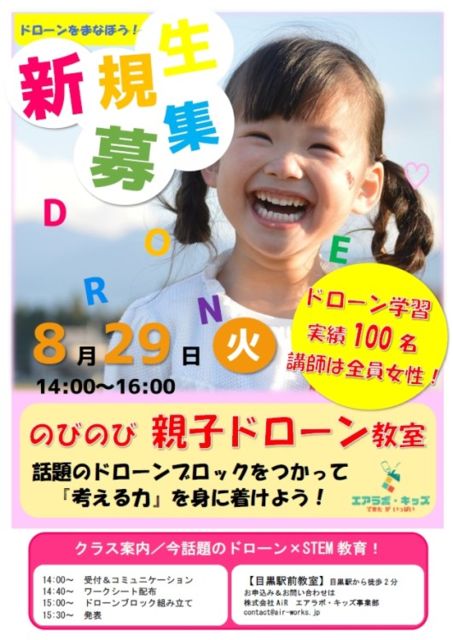 子ども向け体験会「のびのび親子ドローン」講座を開催いたします(^^) ぜひご参加ください(*^ω^*) 2017年子どもに学ばせたい学習ランキング1位! 『考える力』『解決力』を身に着けるSTEM教育♪ 組み立てて、飛ばそう(^^♪ *☼*――――*☼*――――*☼*――――*☼*――――*☼*――――*☼*――――*☼* 日付:8月29日(火) <対象年齢> 小学3〜6年生 <時間> 14:00 開場 14:20 体験会開始 16:00 終了 <住所> 品川区 目黒駅 貸しスペース 目黒駅から徒歩2分