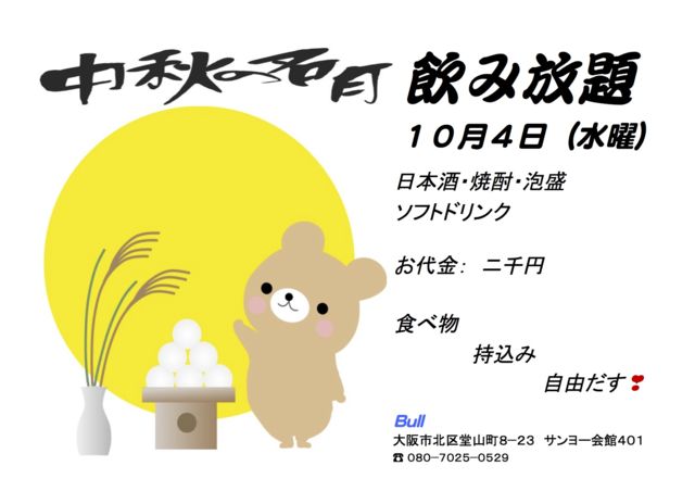 Bull 10月営業予定です。 10月2・3日(月・火) 19時〜21時まで平日お得な早割してます。 ショットコース: ショット3杯+お通し ボトルキープコース: 割り物無料+お通し+キープ¥1,000円引き 各コース¥2,000 10月4日(水) 中秋の名月 飲み放題します。 日本酒・焼酎・泡盛・ソフトドリンク飲み放題 お代金:2,000円 食べ物持ち込み自由です〜 10月10・11日(火・水) 19時〜21時まで平日お得な早割してます。 10月14日(土)第2土曜日恒例の褌デー 17時か