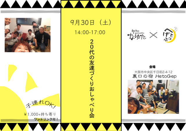 大阪・日本橋 毎月恒例の 「20代の友達づくりおしゃべり会 vol.5」開催! ( *´艸`){こんな方はいませんか?**** □20-29歳である □精神年齢は20代だ □大学・専門学校・大学院などの現役学生さん □子育て奮闘中の若きママ&イクメン中のパパ □社会にもまれながら仕事を頑張り中のお兄さんやお姉さん □自分の夢に向かって一直線のお兄さん&お姉さん そして □いくつになってもあの頃のまま♡ おもしろいことも楽しいことも大好き! 少年少女の心は忘れてないぜー!!というお兄さんお姉さん ******