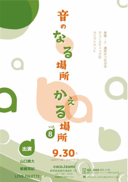 【音のなる場所 かえる場所 vol.8】 9月30日 会場 群馬県高崎市 cocoizumi open 17:30 start 18:00 料金 予約 2000円 当日券 2500円 出演者 山口貴大、板橋晃紀、LOVE PALETTE チケット予約は、DMにて受け付けております。