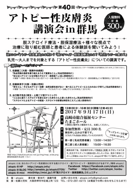 第40回アトピック群馬講演会があるそうです。掲示板や佐藤健二先生のブログに出ていました。 2017年9月17日(日) 13:00-16:30 群馬県高崎市総合福祉センター たまごホール 定員300人 (キッズスペース有り) 講演者:水口聡子先生、佐藤美津子先生、佐藤健二先生