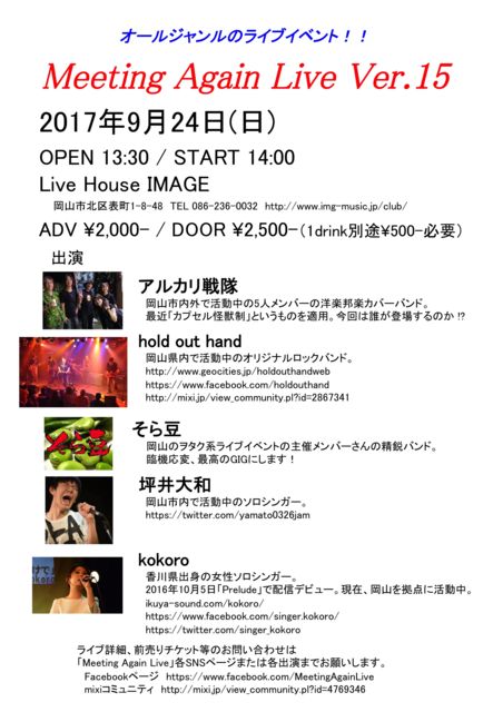 ¡¡9·î24Æü¡ÊÆü¡Ë¤Ë²¬»³»ÔË̶èɽĮ¤Î¥ª¥é¥ó¥ÀÄ̤ê¤Ë¤¢¤ë Live House IMAGE ¤Ë¤Æ¡¢¥ª¡¼¥ë¥¸¥ã¥ó¥ë¤Î¥é¥¤¥Ö¥¤¥Ù¥ó¥È¡ÖMeeting Again Live Ver.15¡×¤ò¹Ô¤¤¤Þ¤¹¡£