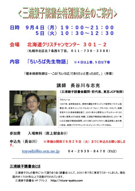 三浦綾子読書会から『特別講演会』のお知らせです。 北海道、特に札幌圏の方は是非是非、この機会をお見逃しなく!! 日時:9月4日(月)19:00〜21:00 5日(火)10:30〜12:30 会 場:北海道クリスチャンセンター 301−2 住 所:札幌市北区北7条西6丁目 電 話:011−736−3388 講 師:長谷川与志充 (三浦綾子読書会顧問・前代表、東京JCF牧師) 内 容:「ちいろば先生物語」 ※4日は上巻、5日は下巻 「榎本保郎牧師は・・・この「ちいろば」