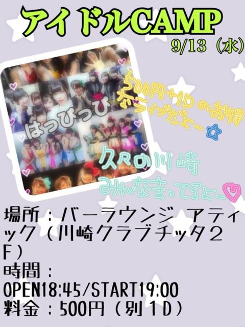 「アイドルCAMP」 日時:9/13(水) 開場18:45 / 開演19:00 会場:川崎クラブチッタ バーアティック 料金:500円(1D別) 出演: