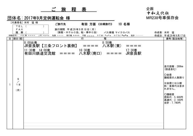 <9月17日 1:05内容変更> 9月の定例運転会です。 スルッとKANSAIバスまつりに行く予定でしたが、開催中止となったため内容を変更し、9月18日(月・祝)に行います。 ○出発時刻 JR奈良駅【三条フロント裏側】 8:00 ○行先 有田川鉄道交流館 ○会費 諸経費の人数割りです。なお、途中参加離脱の場合、負担割合は考慮します。 ※諸経費は7,740円 別紙行程表を参照ください。(添付画像) ○途中からの参加・離脱・当日突然の参加も歓迎します。 不明点はご質問ください。よろしくお願いします。