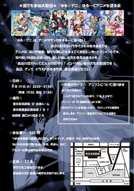 ´ÉÍý¼ÔÍÍ ¥¹¥Ú¡¼¥¹¤ò¤ª¼Ú¤ê¤·¤Þ¤¹¡£ ¡Ö¤æ¤ë¡ù¥¢¥Ë¡×¤Ï¡¢¥¢¥Ë¥á¤ä¥Þ¥ó¥¬¤ò¤æ¤ë¡Á¤¯¸ì¤ê¹ç¤¤¡¢¼«Ê¬¤Î¹¥¤¤Ê¥Ñ¥é¥À¥¤¥¹¤ò¶¦Í¤¹¤ë²ñ¤Ç¤¹¡£ ¥¢¥Ë¥á¤Ï¡¢¾Ð¤¤¤ä´¶Æ°¡¢ÍÍ¡¹¤Ê³Ú¤·¤µ¤òÍ¿¤¨¤Æ¤¯¤ì¤ë¥¨¥ó¥¿¡¼¥Æ¥¤¥ó¥á¥ó¥È¤Ç¤¹¡£ ÃΤé¤Ê¤¤ºîÉʤȽвñ¤Ã¤¿¤ê¡¢¿·¤·¤¤³Ú¤·¤ßÊý¤âȯ¸«½ÐÍè¤ë¤«¤â¢ö ¡ÖºÇ¶á¤Îή¹Ô¤ê¤Ã¤Æ¤É¤ó¤Ê¤Î¤À¤í¤¦¡©¡×¤È¤¤¤¦½é¿´¼Ô¤ÎÊý¤âÂç´¿·Þ¤Ç¤¹¡ª ÅöÆü¡¢¥°¥Ã¥Ä¡¢¥¤¥é¥¹¥È¤¬¤¢¤ëÊý¤Ï¡¢À§Èó»ý»²¤¯¤À¤µ¤¤¡£ ¨¬¨¬¨¬¨¬¨¬¨¬¨¬¨¬¨¬ Æü»þ¡§9·î19Æü(¿å)20:00¡Á21:50 ¡¡¡¡¡¡ (³«¾ì 19:50¡¡Å±¼ý 21:50) ¾ì½ê¡§Åìµþ·Ý½Ñ·à¾ì 5F ²ñµÄ¥ë