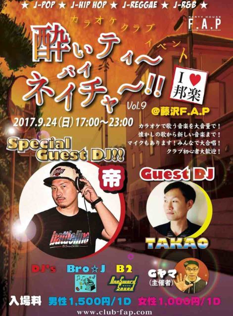 今回で9回目の酔いティ〜バイネイチャ〜‼️ 純粋に老いも若きも 日本の曲で盛り上がるイベントです✋😎 そんな日を彩る、ココロオドルDJ達 🎵 ゲストにはDJ TAKAOに加え横浜から、ハマのエンペラーことDJ 帝が参戦します! クラブ初心者でも楽しめるDJ MIXを是非お楽しみください✋😎 レゲエ畑からは本厚木からBro☆J 、ONESWORDからB2、オールジャンルな選曲とフライヤーデザインも出掛けているDJ yumi!各ジャンルで活躍中のメンバーが揃います。 そして真面目そうなヤツは大体友達、主催者のGヤマです