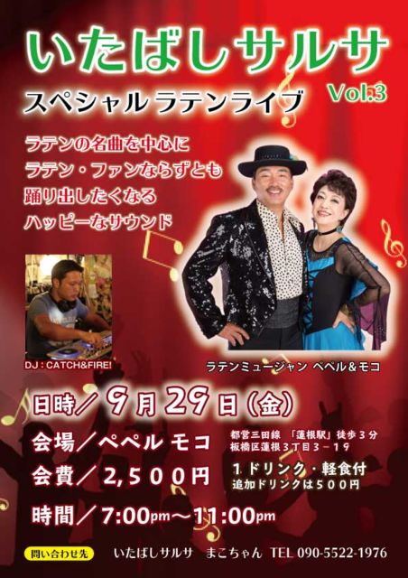 日時:9月29日(金)PM7:00〜11:00 レッスンなしオールダンスタイム スペシャルラテンライブを開催します! 会場:ペペルモコ(都営三田線・蓮根駅) 料金:2,500円(ワンドリンク・軽食付き) ペペル&モコさんによる、ラテンの名曲を中心にラテン・ファンならずとも踊り出したくなるハッピーなサウンドをお届けいたします。