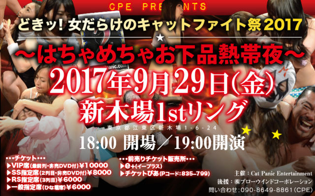 【絶賛!チケットプレオーダー受付中】 今年もやります! 夏のキャットファイト祭りッ! イープラスにて「プレオーダー(特典付きチケット先行抽選販売)」が開始しました! これは、先着順では無く、期間中(〜5/26・18時まで)にお申し込みいただいた方を(順序関係無く)平等に抽選するというシステムですので是非ご利用くださいませ!特典は選手と一緒にリングで撮影する権利! 大変競争率が高いので是非第3希望まで席種をお選びくださいませ! CPEキャットファイト夏祭り どきッ!女だらけのキャットファイト祭2017 〜はちゃめちゃお下品熱帯夜