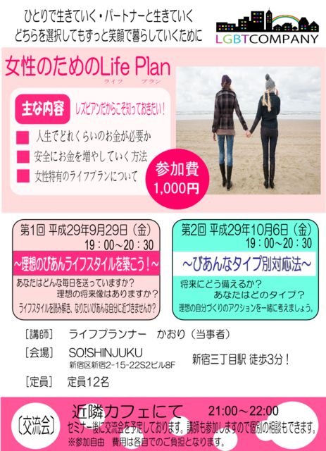 やさしく・楽しく・みんなで築くLGBTCOMPANYセミナー [第1回]理想のびあんライフスタイルを築こう!  ♪日時:9月29日(金)19:00〜20:30 ♪講師:ライフプランナー かおり ♪会場:SO!SHINJUKU  ♪費用:1,000/1人 [第2回]びあんなタイプ別対応法 ♪日時:10月6日(金)19:00〜20:30 ♪講師:ライフプランナー かおり ♪会場:SO!SHINJUKU  ♪費用:1,000/1人 レズビアンだからこそ知っておきたいお金の事、どのくらい貯蓄したらいいの?将来どのくらいのお金がかかるの?そんな漠然とした不安はしっかり計
