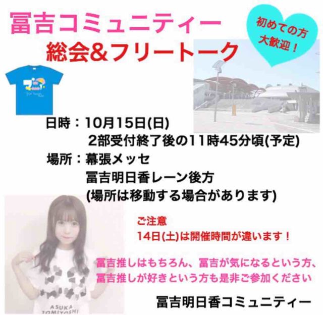 10/14¤ËËëÄ¥¥á¥Ã¥»¤Ç³«ºÅ¤µ¤ì¤ëAKB48°®¼ê²ñ¤Ë¤ÆÇòÀã´õÌÀ¤µ¤ó¤Î¥Õ¥¡¥óÁí²ñ¤ò¹Ô¤¤¤Þ¤¹ ÅöÆü¤Ï²èÁü¤ÎPOP¤ò»ý¤Ã¤Æ¤ªÂÔ¤Á¤·¤Æ¤ª¤ê¤Þ¤¹¡£ Áí²ñ¤È¤¤¤Ã¤Æ¤â·ø¶ì¤·¤¯¤Ê¤¤»¨Ã̤¬Ãæ¿´¤Î½¸¤Þ¤ê¤Ë¤Ê¤ê¤Þ¤¹¤Î¤Ç¡¢¤É¤Ê¤¿¤Ç¤â¤ªµ¤·Ú¤Ë¤´»²²Ã²¼¤µ¤¤¡£ ¢£»þ´Ö 10/14 1Éô¤ª¸«Á÷¤ê½ªÎ»¸å ¡ÊÅÓÃæÈ´¤±¡¢ÅÓÃæ»²²ÃOK¡Ë ¢£½¸¹ç¾ì½ê ¥ì¡¼¥ó¸åÊýÂÔµ¡¥¨¥ê¥¢ ¢£Áí²ñÆâÍÆ ¡¦¥Õ¥¡¥ó´é¹ç¤ï¤» ¡¦8´üÀ¸1¼þǯ¤ª½Ë¤¤¤Ë¤Ä¤¤¤Æ ¡¦·à¾ì¸ø±é²ó¿ô100Æü¤Î¤ª½Ë¤¤¤Ë¤Ä¤¤¤Æ ¡¦¥³¥ß¥å¥Ë¥Æ¥£±¿±Ä¤Ë¤Ä¤¤¤Æ ¡¦»¨ÃÌ ²¿¤«¼ÁÌä¤ä´õ˾Åù¤¬¤¢¤ê¤Þ¤·¤¿¤é¥³¥á¥ó¥È¤ò¤ª´ê¤¤Ãפ·