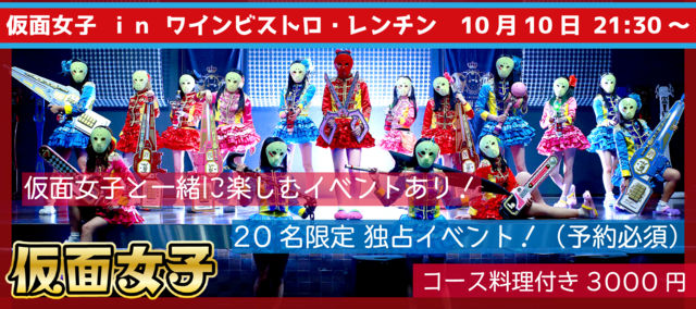 【ワインビストロ・レンチン!にて乾杯の掛け声&チェキ会開催! 】 さいたまスーパーアリーナ単独ライブ15000人動員を達成し、 オリコンチャート1位を記録した『元気種☆』は、なんとインディーズ女性初の快挙! ライブ本数は年間1000本を超え、現在、地下アイドル最強の名を欲しいままにしている『仮面女子』が 食フェス開催期間中にワインビストロレンチン!にてイベントを開催致します♪ ■イベント内容 ・一緒に乾杯 ・チェキ ・じゃんけんプレゼント大会 (景品付き) ■会場 ワインビストロレンチン! 福岡市中央区大名