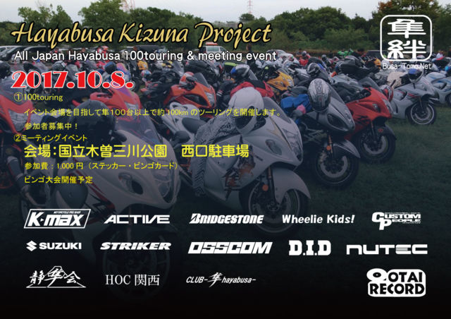 Hayabusa Kizuna Project Æü»þ¡§2017ǯ10·î8Æü ¾ì½ê¡§¹ñ±ÄÌÚÁ¾»°Àî¸ø±à¡¡²ÏÀî´Ä¶³Ú±à À¾¸ýÃó¼Ö¾ì ¡Êµîǯ¤ÈƱ¤¸Êè½ê¤Ç¤¹¡Ë Ʊ»þ¥¤¥Ù¥ó¥È(¡°¡þ¡°) ¢ãÈ»100¥Ä¡¼¥ê¥ó¥°¡ª¢ä Ë¿½ê¤Ë½¸¹ç¤·È»100Âæ¡ÊͽÄê¡Ë¤Ç¥¤¥Ù¥ó¥È²ñ¾ì¤Þ¤Ç¤ß¤ó¤Ê¤Ç¥Ä¡¼¥ê¥ó¥°¤¹¤ë¤È¤¤¤¦´ë²è¤Ç¤¹¡£ ²ñ¾ì¤Þ¤ÇÌó100£ë£íÄøÅÙ¤òͽÄꤷ¤Æ¤ª¤ê¤Þ¤¹¡£ ¤´»²²Ã¤¤¤¿¤À¤±¤ëÊý¡¢Ê罸¤·¤Æ¤ª¤ê¤Þ¤¹¡£ º£Ç¯¤«¤é¥¤¥Ù¥ó¥È̾¤òÊѹ¹¤·¤Þ¤·¤¿¡£ µ¹¤·¤¯¤ª´ê¤¤¤·¤Þ¤¹(#^.^#)