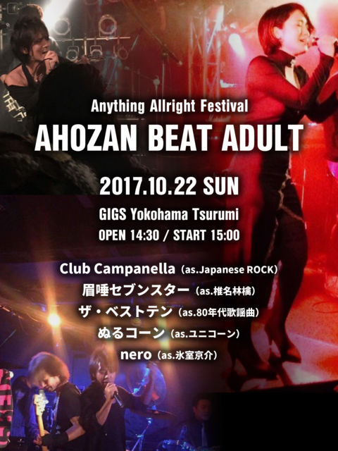 AARFes ¿ÀÆàÀî¤Ç½é³«ºÅ¡ª¡ª 10/22 14»þ30ʬ³«¾ì 15»þ³«±é ÄḫGIGS http://livehouse-gigs.com/tsurumi/ ¥Á¥±¥Ã¥ÈÂå1500±ß¡Ü1¥É¥ê¥ó¥¯ 14:30¡¡³«¾ì 15:00¡¡³«±é 15:00¡Á15:40¡¡Club Campanella 15:40¡Á15:50¡¡Å¾´¹ 15:50¡Á16:30¡¡ÈýÂÃ¥»¥Ö¥ó¥¹¥¿¡¼ 16:30¡Á16:40¡¡Å¾´¹ 16:40¡Á17:20¡¡¥¶¡¦¥Ù¥¹¥È¥Æ¥ó 17:20¡Á17:35¡¡Å¾´¹ 17:35¡Á18:15¡¡¤Ì¤ë¥³¡¼¥ó 18:15¡Á18:35¡¡Å¾´¹¡õ¤¸¤ã¤ó¤±¤óÂç²ñ 18:35¡Á19:25¡¡nero 20»þ¤´¤í¤è¤ê¥é¥¤¥Ö¥Ï¥¦¥¹¤Ë¤ÆÂǤÁ¾å¤²¡ª ¤ªµÒÍͤ⻲²ÃOK¤Ç¤¹¡ª¡ª ²Ä°¦¤¤¥¢¥¯¥»¥µ¥ê¡¼Åù¤ÎʪÈΤ¢¤ê¡£ ¤½¤·¤Æº£²ó¤â¹±Îã