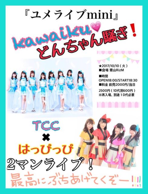 ¡Ö¥æ¥á¥é¥¤¥Ömini¡×¡Ákawaiku¤É¤ó¤Á¤ã¤óÁû¤®¡ª¡Á Æü»þ¡§10/10(²Ð) ³«¾ì18:00 / ³«±é18:30 ²ñ¾ì¡§ÀÄ»³RizM ÎÁ¶â¡§Á°Çä2,000±ß / ÅöÆü2,500±ß (1DÊÌ600±ß) ¢¨ºÆÆþ¾ì²Ä(Í×1D) ½Ð±é¡§¤Ï¤Ã¤Ô¤Ã¤Ô¡¿ÅìµþCuteCute