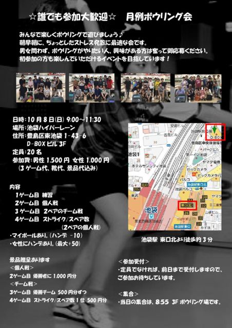 ¤ß¤ó¤Ê¤Ç³Ú¤·¤¯¥Ü¥¦¥ê¥ó¥°¤ÇÍ·¤Ó¤Þ¤·¤ç¤¦ (^O^)¡¿ Ä«¡¢ÁáÄ«¤Ë¤Á¤ç¤Ã¤È¤·¤¿¥¹¥È¥ì¥¹È¯»¶¤ËºÇŬ¤Ê²ñ¤Ç¤¹¡£ Ã˽÷Ìä¤ï¤º¡¢¥Ü¥¦¥ê¥ó¥°¤¬¤ä¤ê¤¿¤¤¿Í¡¢¶½Ì£¤¬¤¢¤ëÊý¤Ïʳ¤Ã¤Æ¸æ±þÊ礯¤À¤µ¤¤¡£ ½é»²²Ã¤ÎÊý¤â³Ú¤·¤ó¤Ç¤¤¤¿¤À¤±¤ë¥¤¥Ù¥ó¥È¤òÌܻؤ·¤Æ¤¤¤Þ¤¹¡£¢ö Æü»þ 10·î8Æü(Æü) 9:00¡Á11:30 ¾ì½ê ¥Ï¥¤¥Ñ¡¼¥ì¡¼¥ó ½»½ê ËÅç¶èÅìÃÓÂÞ1-43-6 D-BOX¥Ó¥ë3F ½¸¹ç 8:55 ¸½Ãϥܥ¦¥ê¥ó¥°¾ì 3F¼õÉÕ ¥¢¥¯¥»¥¹ ÃÓÂÞ±Ø ÅìË̸ý¤«¤éÅÌÊâ3ʬ http://www.hyperlane.com/contents/access/ ¡ÃÓÂÞ±Ø Åì¸ýËÌ ½Ð¸ý¤òÌܻؤ·¤Þ¤¹¡£ ¢Åì¸ýËÌ ½Ð¸ýÉÕ¶á¤ËÅì¸ýËÌ ¸ò