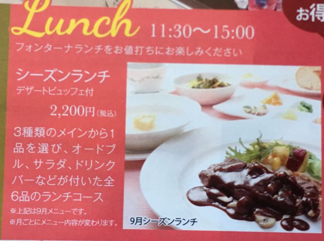 ËÅĤο¹¤ÎÃæ¤Ë¤¢¤ë¥ì¥¹¥È¥é¥ó¡Ö¥Õ¥©¥ó¥¿¡¼¥Ê¡×¤Ç¥Ç¥¶¡¼¥È¥Ó¥å¥Ã¥Õ¥§ÉÕ¤¤Î¥é¥ó¥Á¤·¤Þ¤»¤ó¤«¡© »°¼ïÎà¤ÎÃæ¤«¤é°ìÉʥᥤ¥ó¤òÁª¤ó¤Ç¡¢ ¥ª¡¼¥É¥Ö¥ë¡¢¥µ¥é¥À¡¢¥É¥ê¥ó¥¯¥Ð¡¼¤Ê¤É¤¬ÉÕ¤¤¤¿¥³¡¼¥¹¤Ç¤¹¡£ ¥Ç¥¶¡¼¥È¥Ó¥å¥Ã¥Õ¥§¤¬ÉÕ¤¤Þ¤¹¡£ 2200±ß¤¯¤é¤¤¡£ http://www.forestahills.jp/sp/restaurants/ ¤É¤Ê¤¿Íͤ⤪µ¤·Ú¤Ë¤´»²²Ã¤¯¤À¤µ¤¤¡£ ¤è¤í¤·¤¯¤ª´ê¤¤Ãפ·¤Þ¤¹m(_ _)m¡£